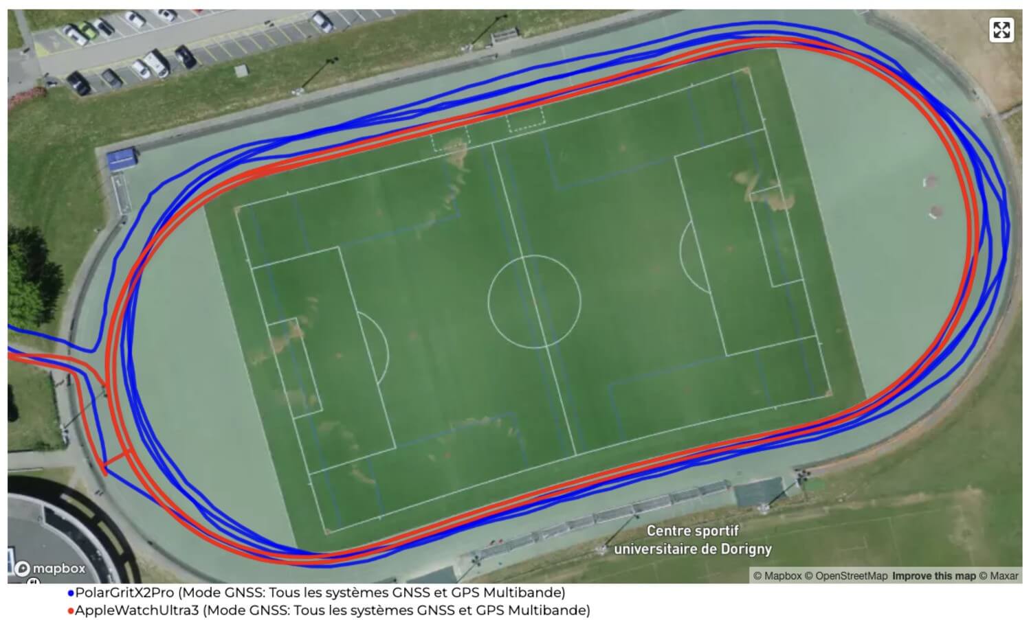 Voici une activité de course à pied ou j’ai activé le mode piste automatique de l’Apple Watch Ultra 3 et j’ai réalisé ensuite 3 tours dans le couloir 1, et 2 tours dans le couloir 2. On voit bien la différence des traces absolument parfaites (alignées sur les couloirs) de l’Apple Watch et le mode freestyle de la Polar Grit X2 Pro: