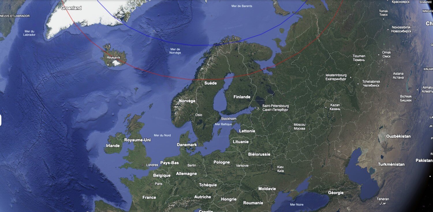 Enfin, la constellation Globalstar utilisée par Apple offre la possibilité, dans de bonnes conditions de dégagement sur le ciel, d’envoyer un message via satellite jusqu’à une latitude de 70°Nord (ligne rouge), alors que les satellites utilisés par Garmin ne fonctionneront vraisemblablement que jusqu’aux alentours de 65°Nord (ligne bleue). Cela rend la zone d’utilisation de l’Apple Watch plus grande. Par exemple ici sur le nord de l’Europe: