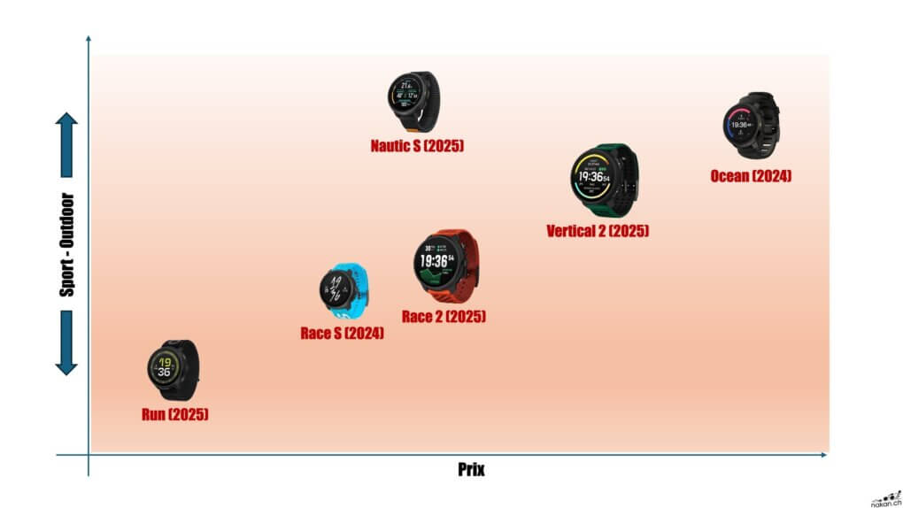 La Suunto Run (lire le test complet) est une montre d’entrée de gamme plutôt dédiée à la pratique de la course à pied, alors que les autres modèles sont plus polyvalents. La Suunto Race 2 (lire l’article) ainsi que la Race S sont des montres assez généralistes même si elles se destinent avant tout aux amateurs d’outdoor et de trail. La Vertical 2 (lire le test complet) elle est plus clairement typée vers un usage de longue durée et plus engagé dans l’ultra-trail et l’outdoor.