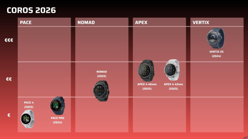 La gamme de COROS a largement été renouvelée en 2025, mais certains modèles sortis il y a plus de temps figurent toujours au programme, comme la Pace Pro ou la Vertix 2S. Voici la gamme actuelle de COROS vue sous forme graphique: