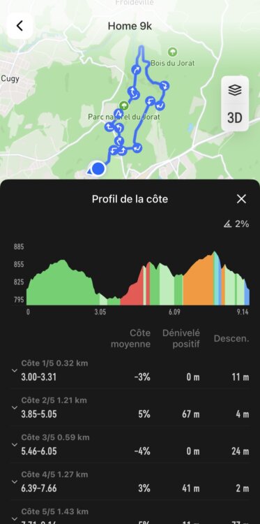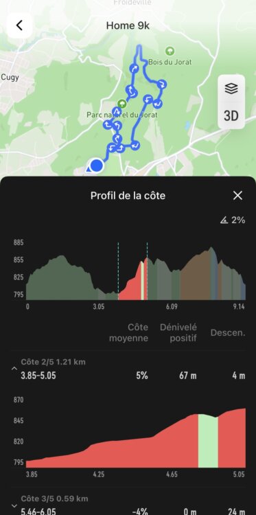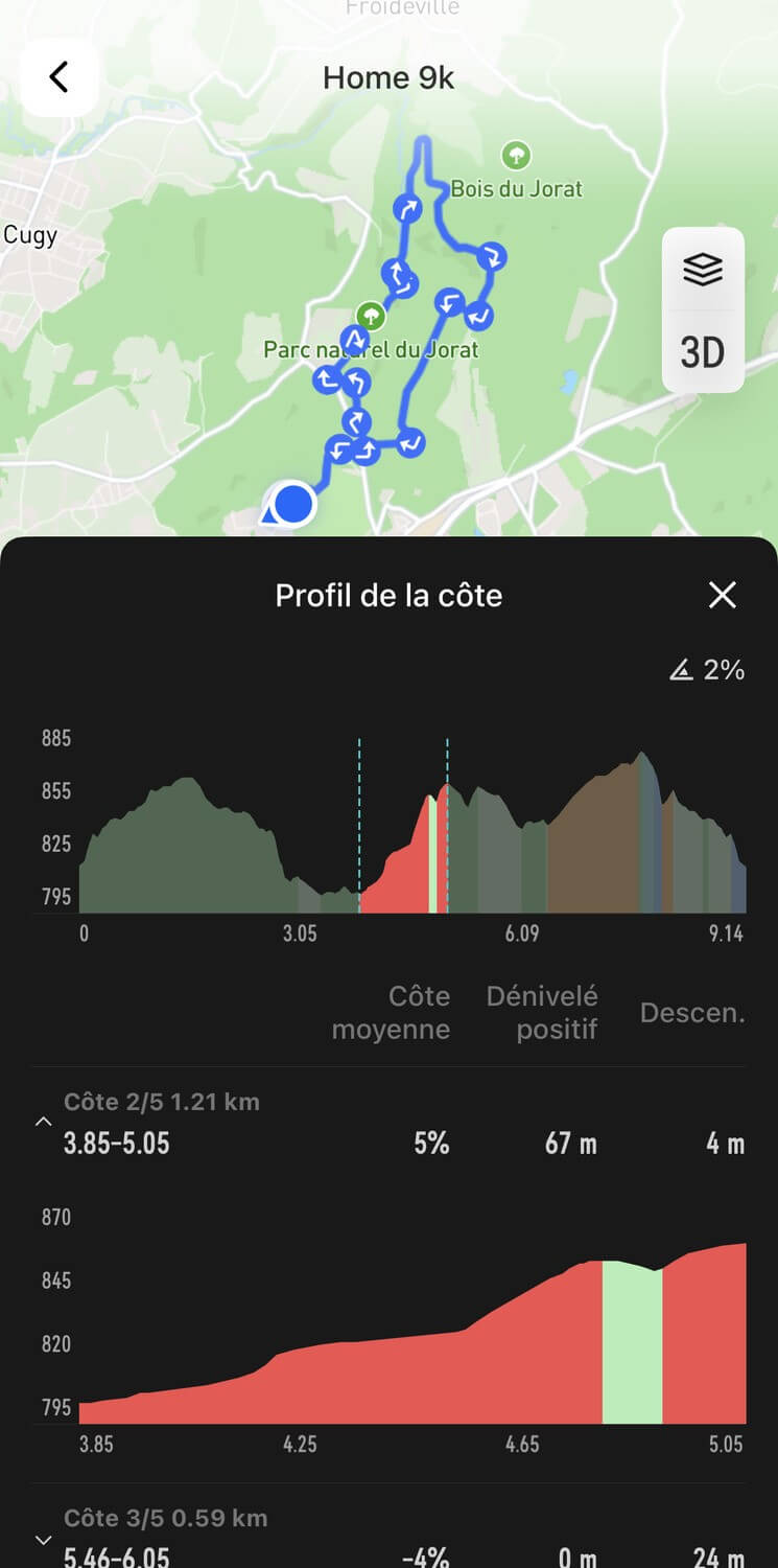 La première étape consiste à créer ou importer un itinéraire. On peut le créer depuis l’outil dédié de la plateforme de COROS, ou importer un fichier GPX généré via une autre application. Lorsqu’on enregistre le parcours, l’app va automatiquement découper le profil d’altitude et afficher le détail des montées et des descentes détectées. On peut afficher le détail des montées, mais dans l’app, on ne voit pas les descentes détectées: