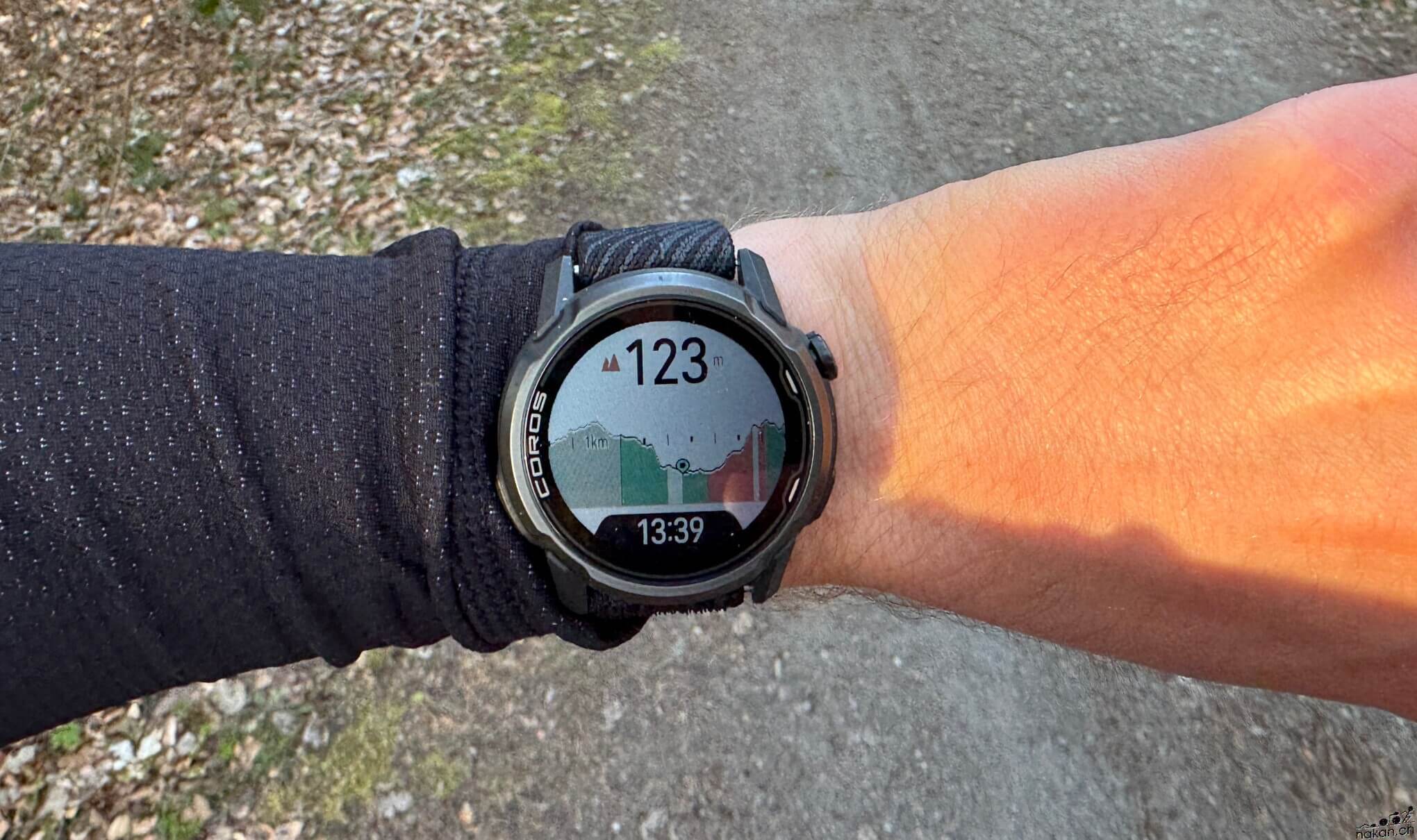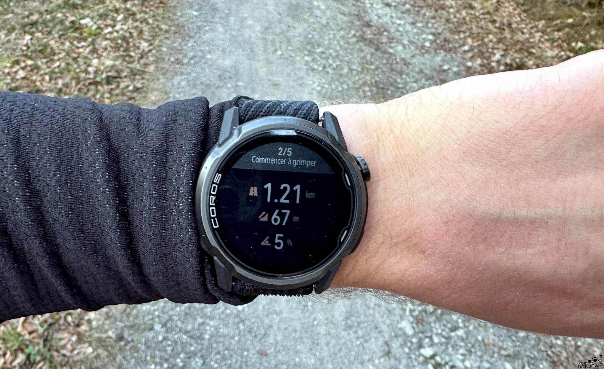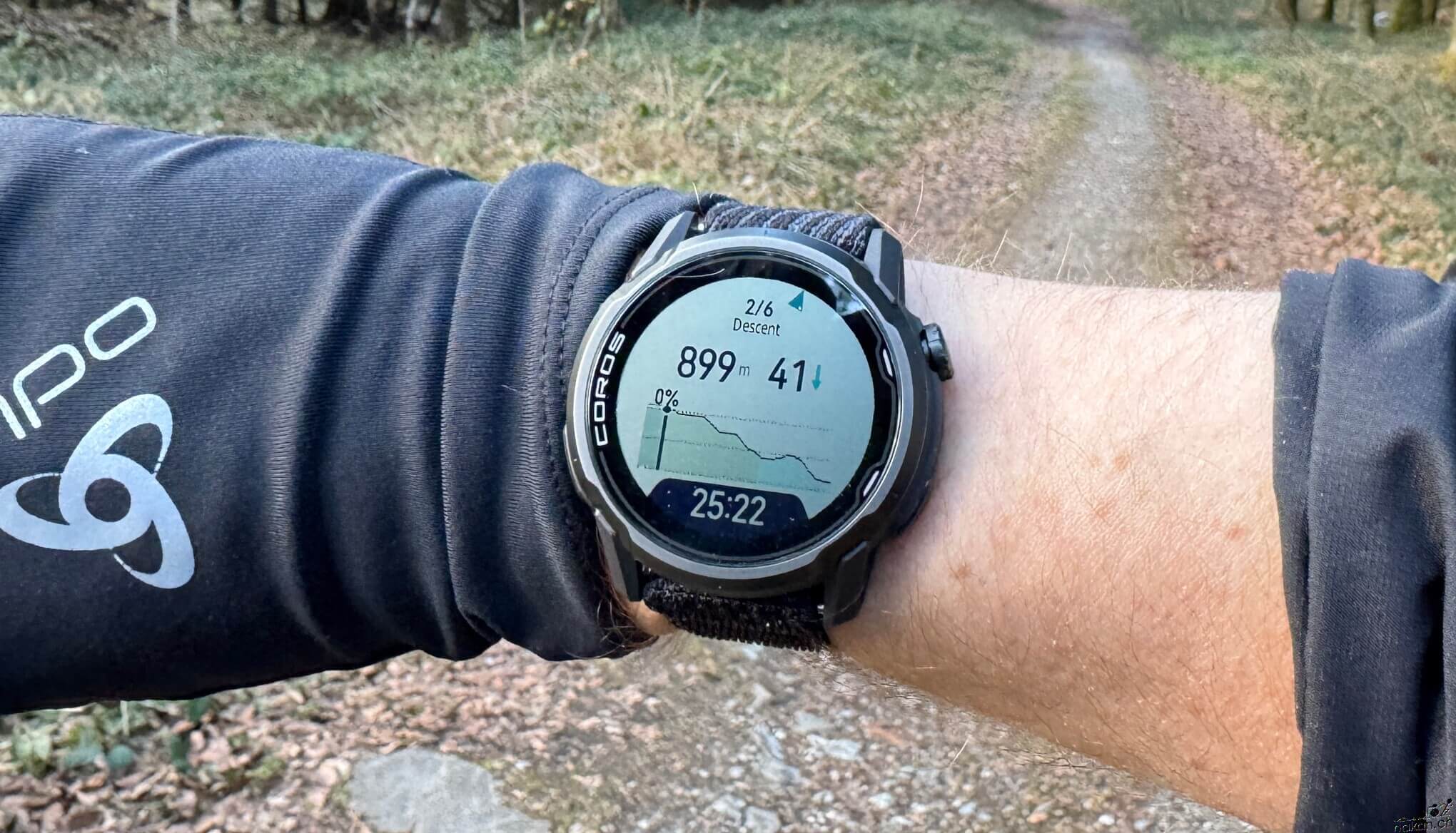 Troisième étape: consulter les détails des montées et des descentes sur la montre. COROS a ajouté un nouvel écran qui, lorsqu’il n’est pas utilisé pour afficher une montée ou une descente active, affiche le dénivelé à venir: