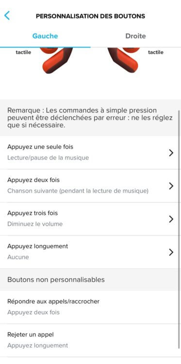 La surface externe des écouteurs, là ou se situe l’inscription « Suunto », est tactile. C’est à dire que les deux écouteurs peuvent percevoir des contrôles par tapotement. Ces contrôles sont configurables dans l’app Suunto. On peut configurer des contrôles différents sur l’écouteur droit et l’écouteur gauche. Ce qui permet par exemple un ajustement du volume vers le haut avec un contrôle sur le droit, et vers le bas sur le gauche. En tout cas c’est ce que j’ai configuré sur le mien: