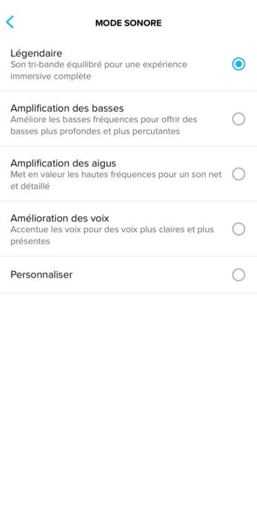 Dans l’app, on peut régler l’égalisation du son, soit via des préréglages, ou alors de manière entièrement personnalisée: