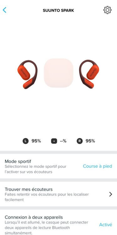 On l’a déjà largement vu ci-dessus, l’app Suunto permet de largement interagir avec le Spark, et de le configurer pour une utilisation personnalisée. Cela se passe dans l’espace désormais réservé aux casques audio de l’app Suunto.