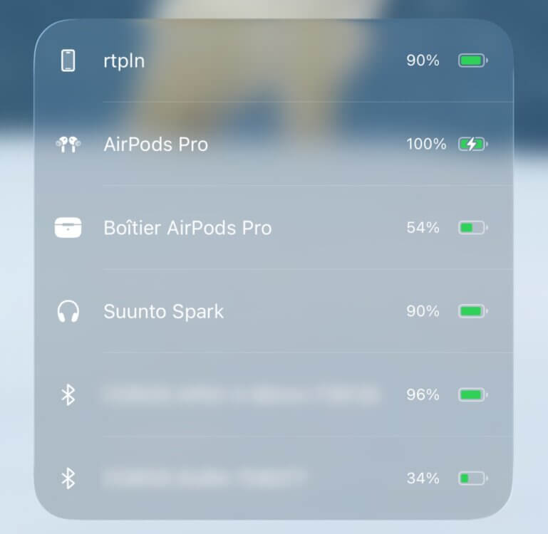 Une fois connectés en Bluetooth, le casque affiche l’état de charge des écouteurs sur l’appareil auquel il est connecté. Par exemple sur l’iPhone. On peut afficher l’état de charge de l’ensemble uniquement dans l’app Suunto, si les écouteurs sont rangés dans le boîtier: