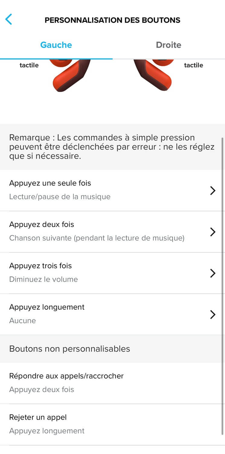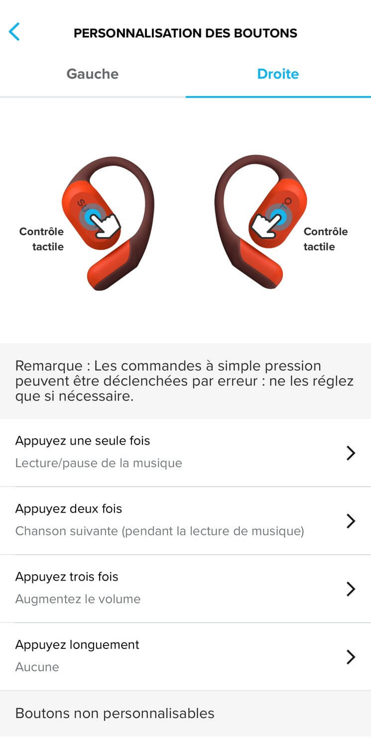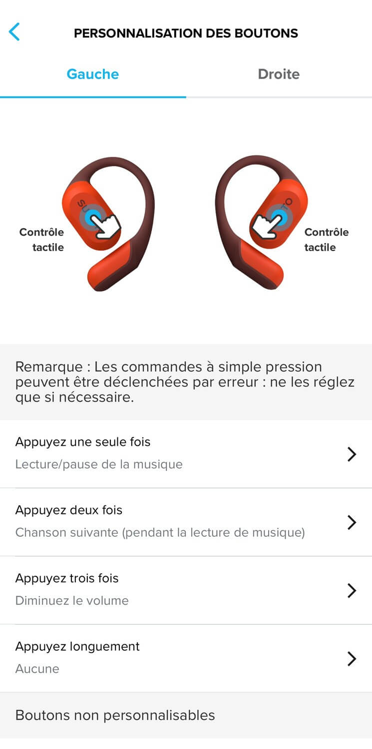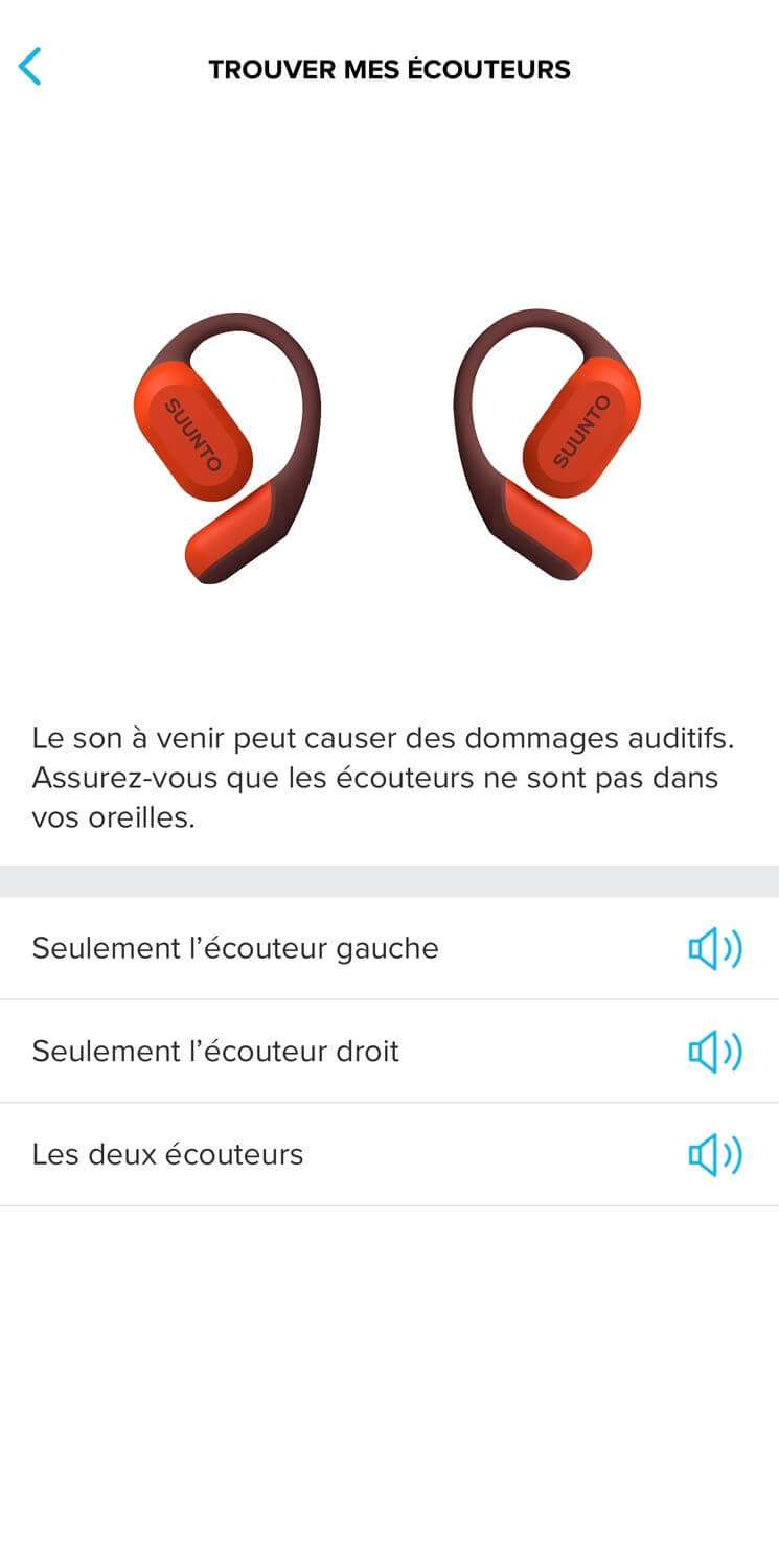 La surface externe des écouteurs, là ou se situe l’inscription « Suunto », est tactile. C’est à dire que les deux écouteurs peuvent percevoir des contrôles par tapotement. Ces contrôles sont configurables dans l’app Suunto. On peut configurer des contrôles différents sur l’écouteur droit et l’écouteur gauche. Ce qui permet par exemple un ajustement du volume vers le haut avec un contrôle sur le droit, et vers le bas sur le gauche. En tout cas c’est ce que j’ai configuré sur le mien: