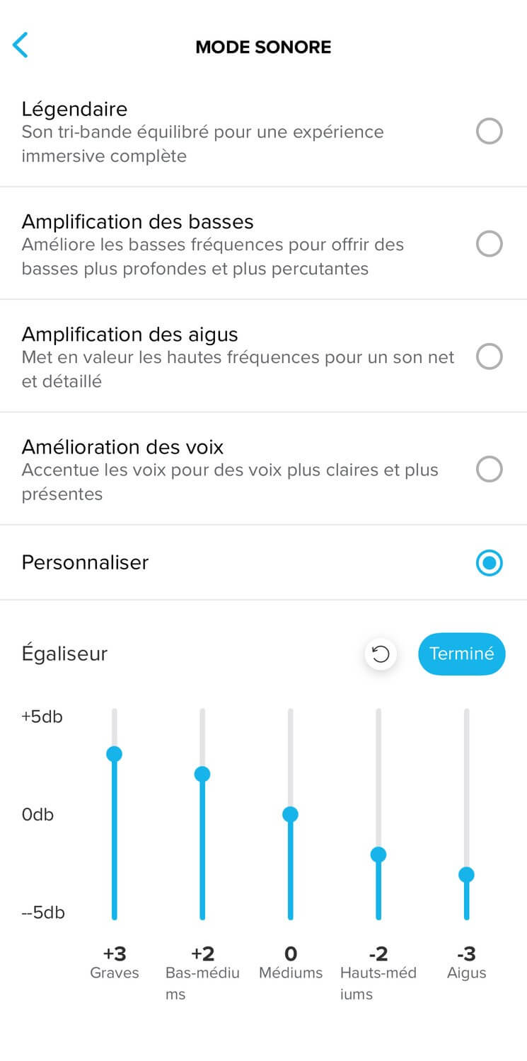 Dans l’app, on peut régler l’égalisation du son, soit via des préréglages, ou alors de manière entièrement personnalisée: