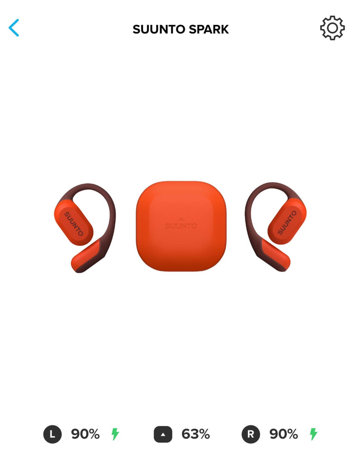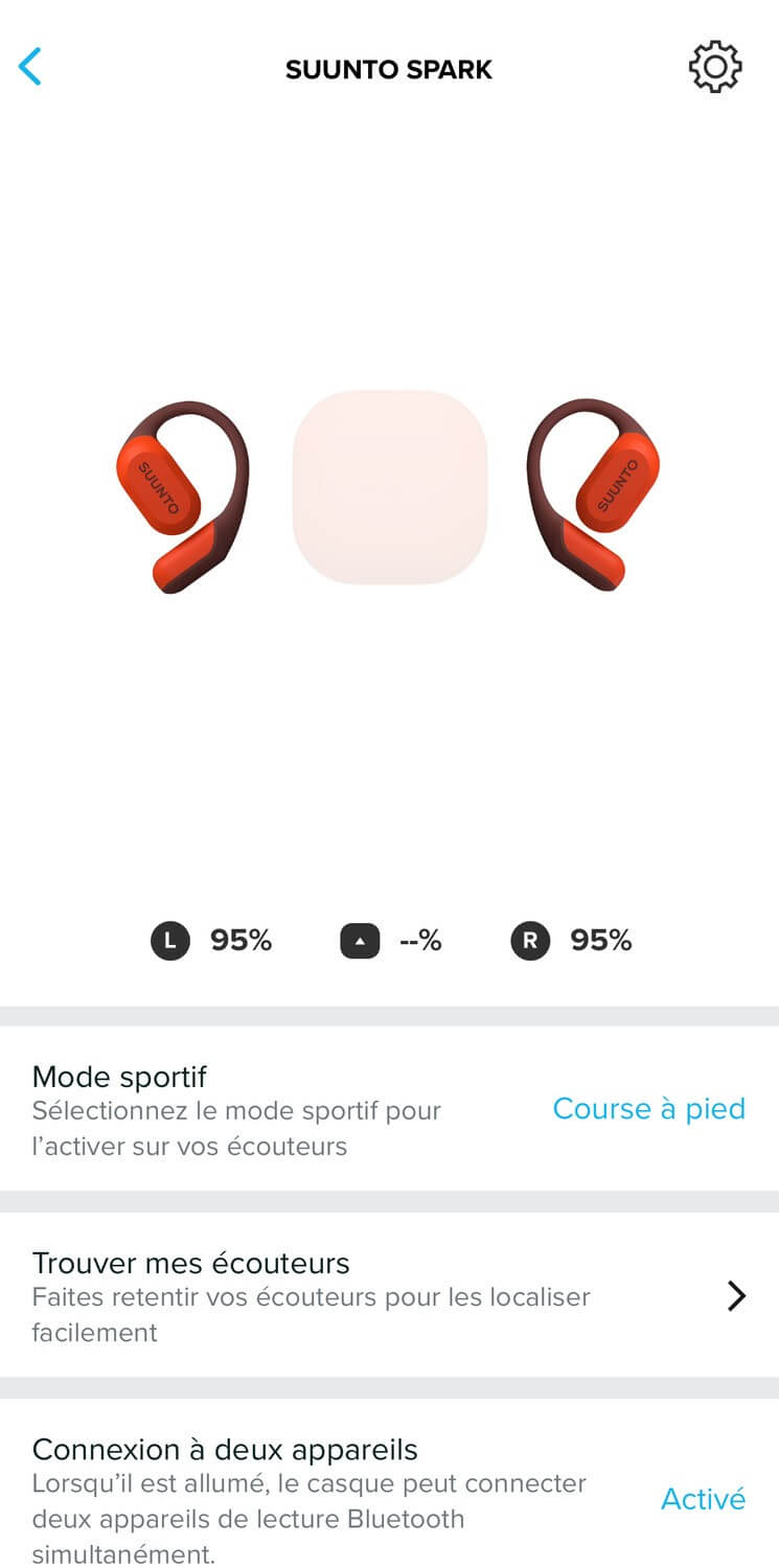 Une fois connectés en Bluetooth, le casque affiche l’état de charge des écouteurs sur l’appareil auquel il est connecté. Par exemple sur l’iPhone. On peut afficher l’état de charge de l’ensemble uniquement dans l’app Suunto, si les écouteurs sont rangés dans le boîtier: