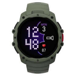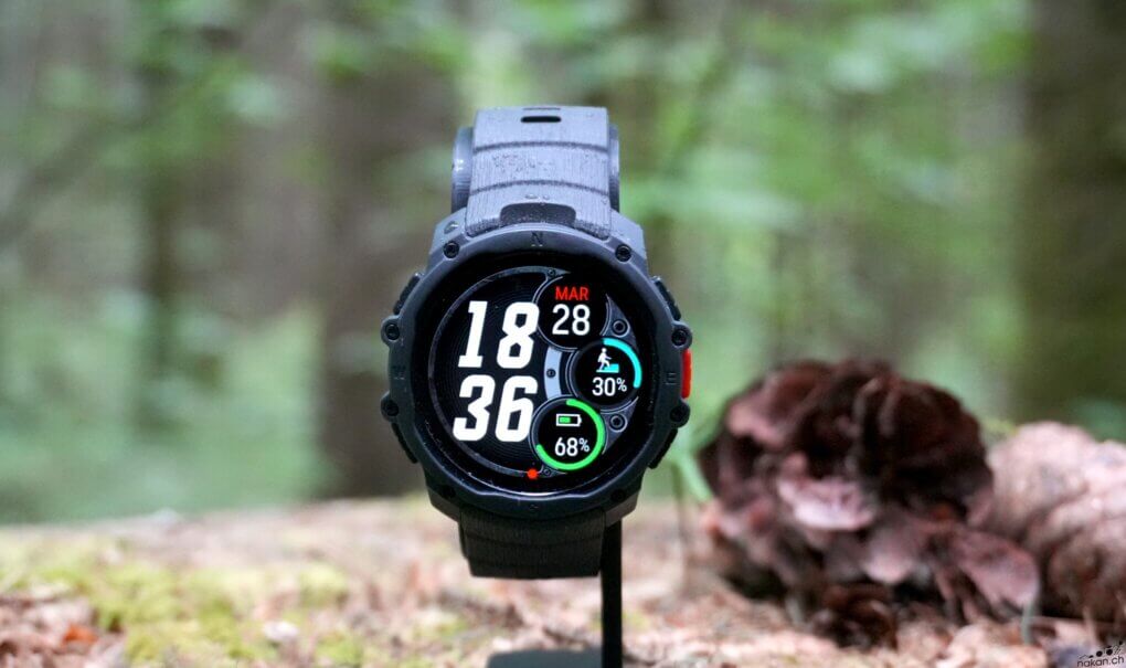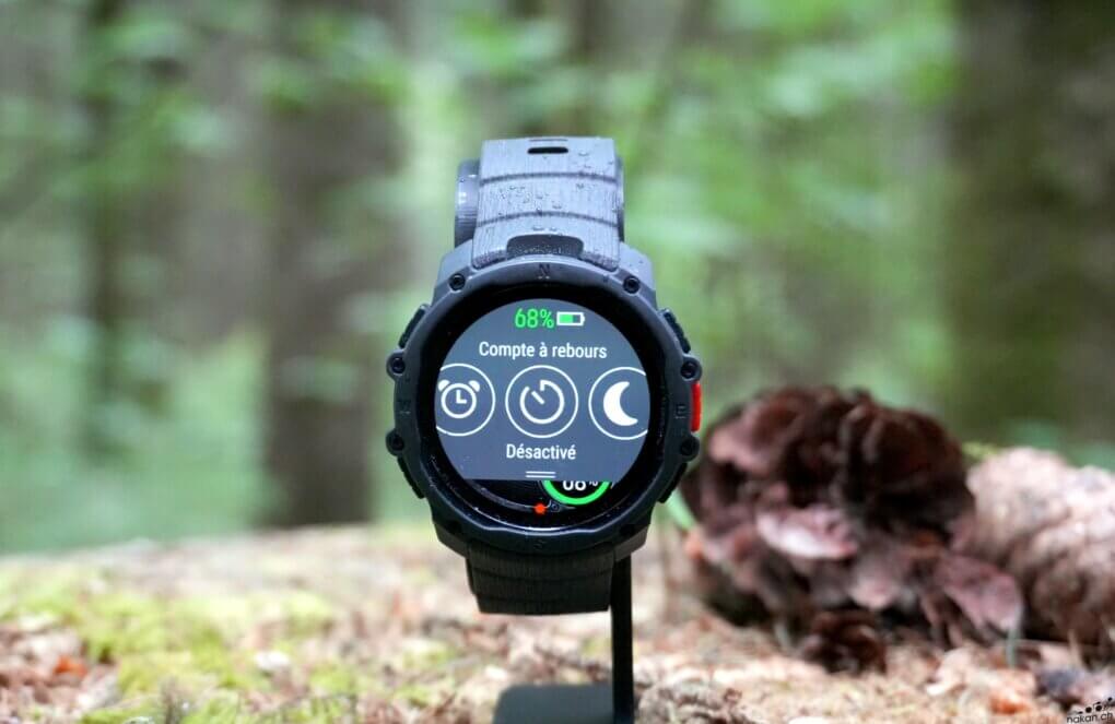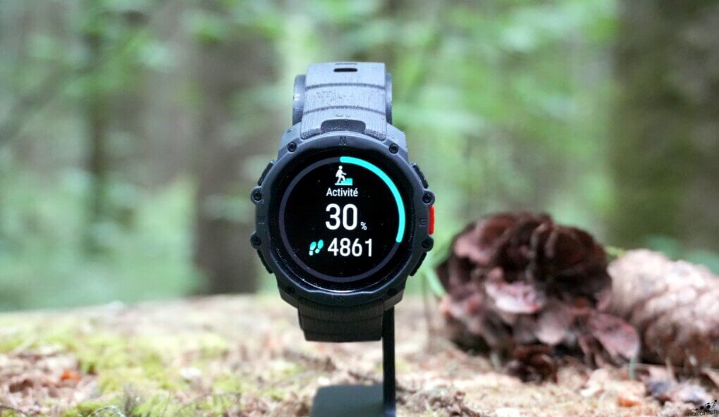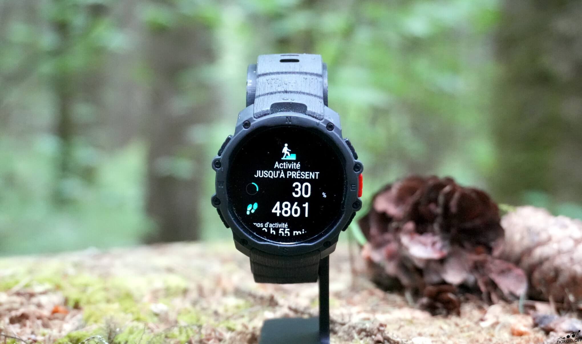 La montre affiche une finition correcte. Pour le prix, il faut bien s’attendre à du plastique et du composite, et pas de cerclage en métal. Le boîtier composite donne une impression de légèreté appréciable avec ses 48 grammes sur le poignet. La lunette composite et le verre Gorilla Glass 3 sont adaptés à un usage outdoor sans offrir la même robustesse qu’un verre saphir. La certification MIL-STD-810H garantit toutefois une solidité globale face aux chocs et dans toutes les conditions atmosphériques. L’étanchéité annoncée à 50 mètres est largement suffisante pour une utilisation sportive intensive, y compris en natation ou en sports nautiques.