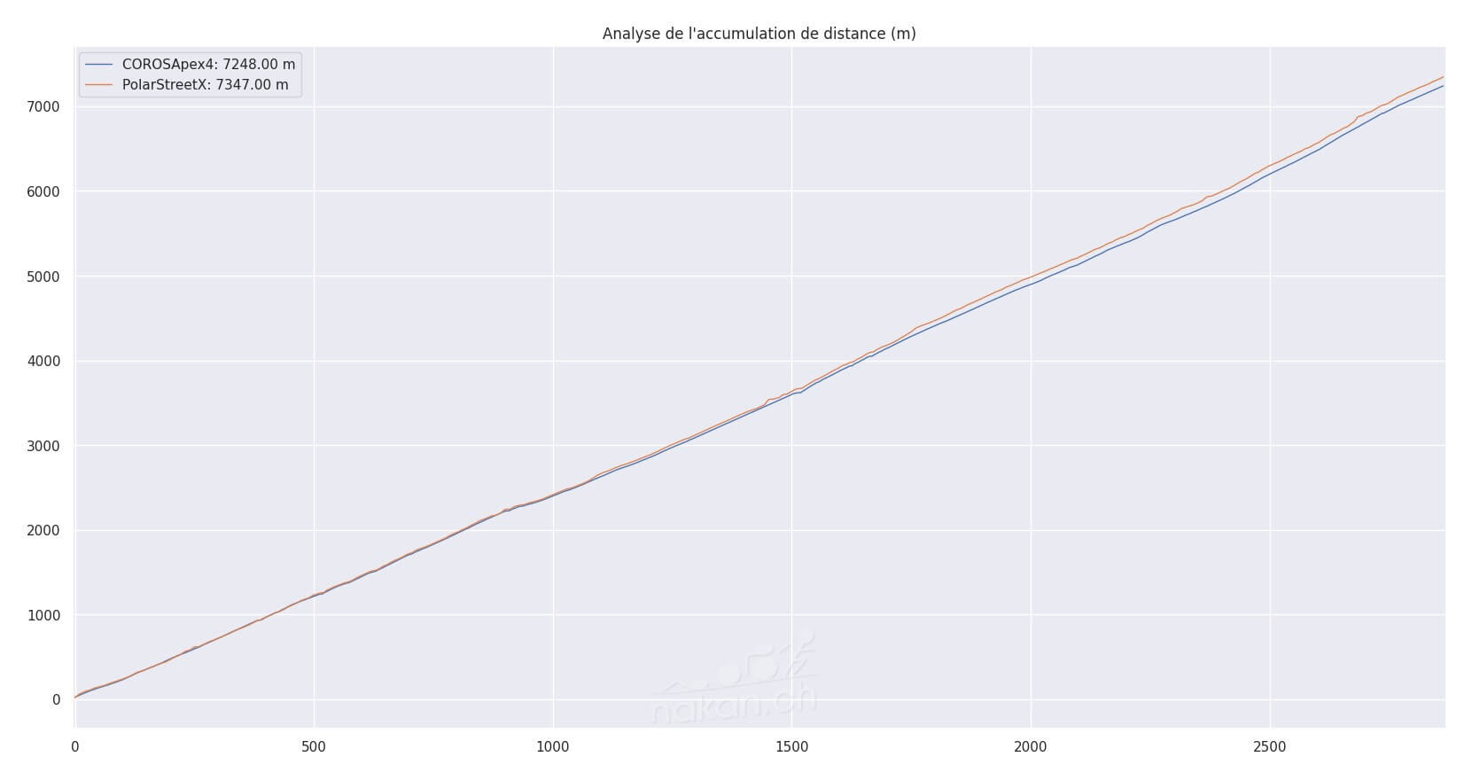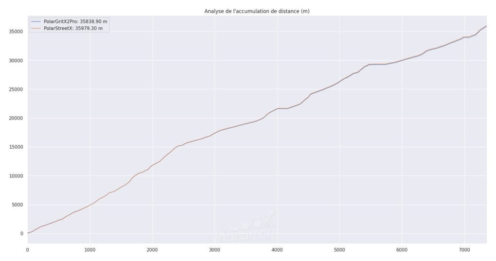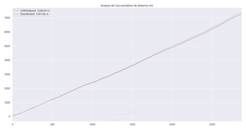 On voit sur le graphique d’accumulation de distance que ces écarts ont fini par créer une différence de 100m sur une petite sortie de course à pied de quelques 7km: