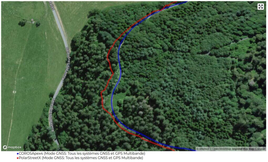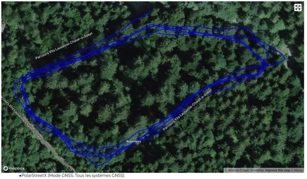 Lors de ce test, je réalise plusieurs fois la même boucle en sous-bois pour voir la répétabilité de la mesure GPS de la montre. On voit que sans être une catastrophe, la trace de la Street X est loin d’être très reproductible et constante: