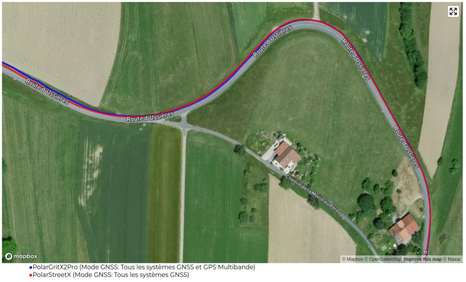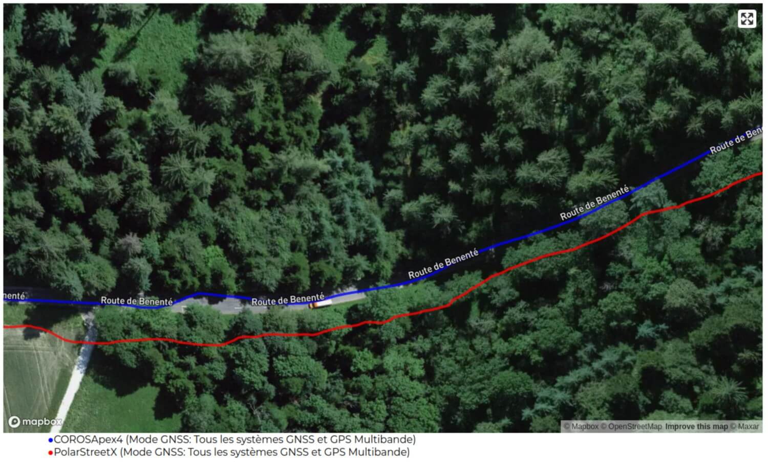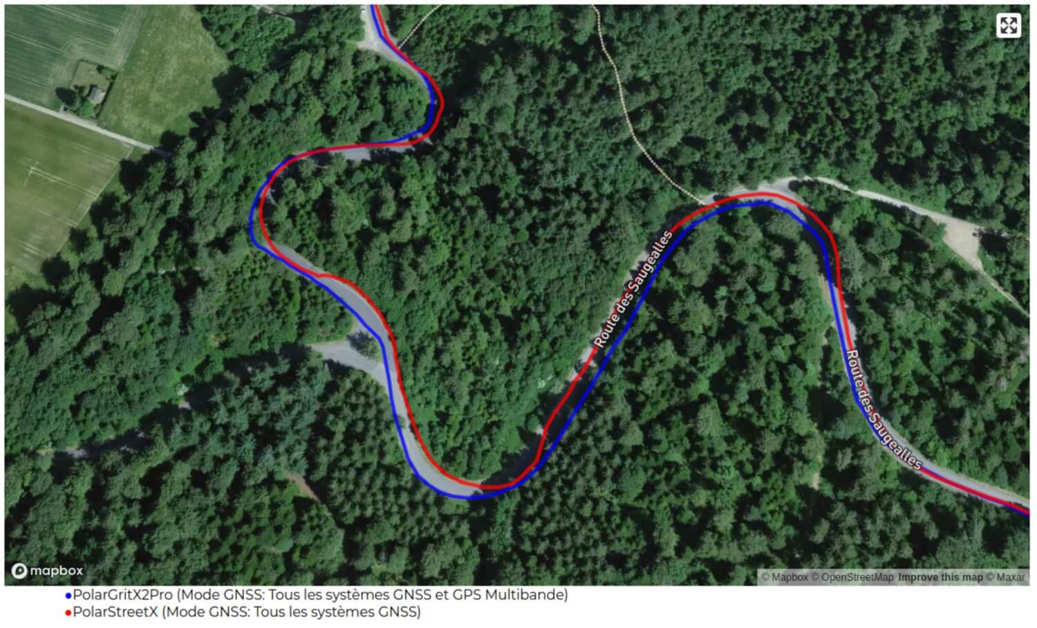 Lors de cette sortie à vélo de route, la montre est comparée à la Grit X2 Pro, également de Polar. La trace, sur ce type d’activités, est bonne en général. Quelques écarts, mais absolument rien d’anormal, même face à une montre GPS double fréquence: