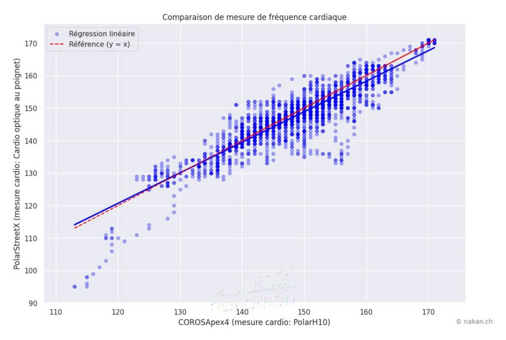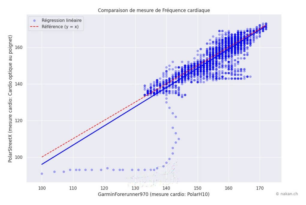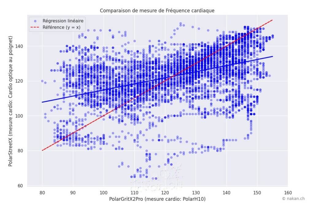 Le graphique de régression est particulièrement saisissant: les points sont éparpillés dans tous les sens, sans aucune corrélation visible. On retrouve des mesures de la montre à 70 bpm alors que la référence indique 140 bpm, et inversement des zones où les deux valeurs coïncident presque parfaitement. La droite de régression, si tant est qu’on puisse en tracer une, n’a ici aucune valeur prédictive.