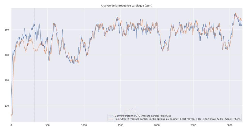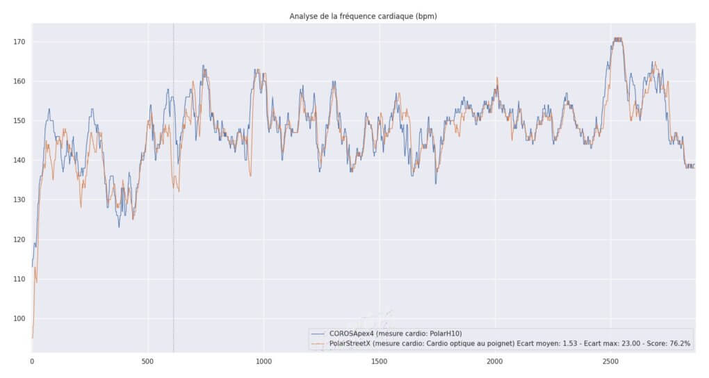 Le score de 76% place ce comparatif dans la catégorie Indicatif. C’est un résultat honnête pour une course à allure modérée : la montre suit bien les grandes tendances de la séance et serait tout à fait utilisable pour un entraînement en endurance de base, où la précision au bpm près n’est pas critique. C’est en revanche insuffisant pour des séances plus intenses ou la précision de l’effort doit être analysée de manière plus fine.