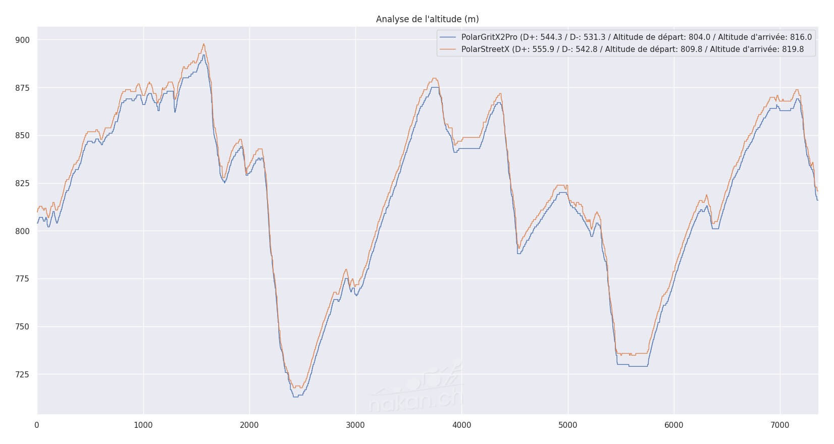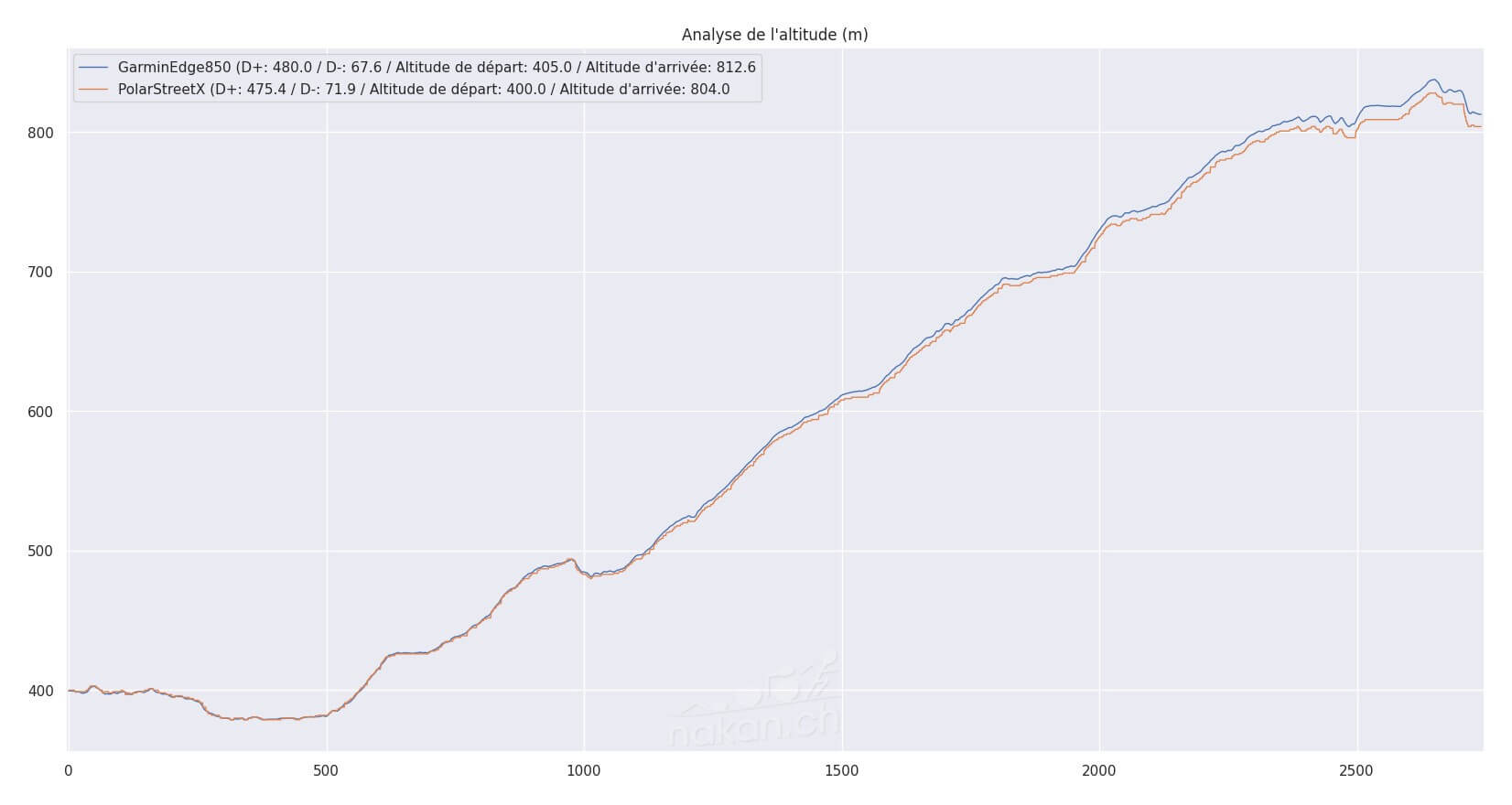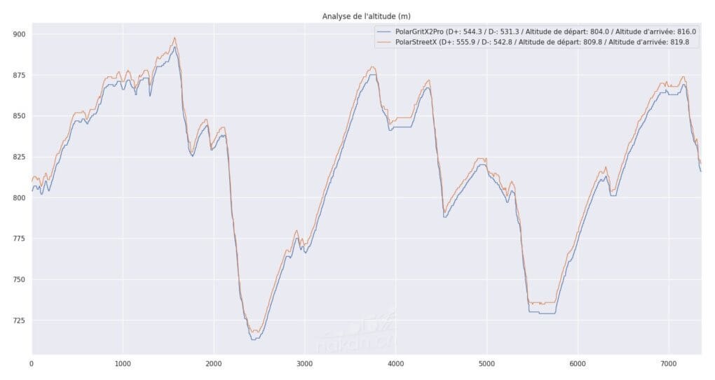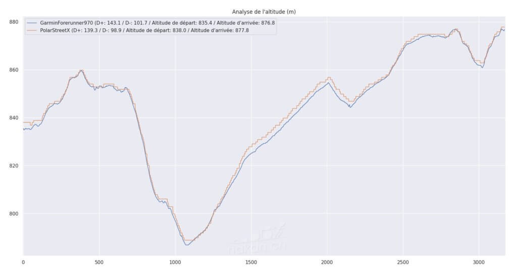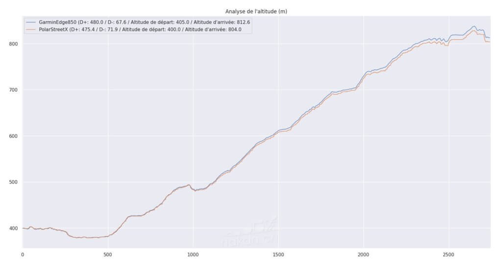 On voit que la mesure est un peu plus « dentelée » sur la Street X, mais avec un algorithme correct de lissage, on obtient des données cohérentes avec la mesure du Edge 850. L’écart en absolu à l’arrivée est de quelques mètres seulement, un belle performance d’ensemble sur cette mesure.