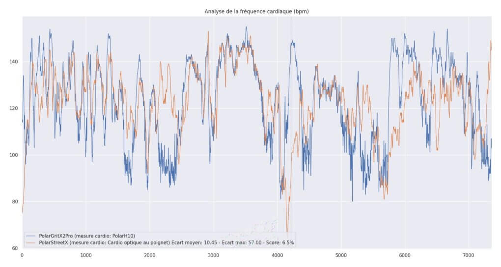 Les courbes ne se superposent quasiment jamais de façon satisfaisante. On voit dès le départ un problème de démarrage classique, avec la montre qui accuse un retard de près de 40 bpm en début de séance. Passé ce cap, la mesure semble vouloir s’aligner, mais sans jamais vraiment y parvenir durablement. Tout au long des deux heures, la montre enchaîne les épisodes de décrochages: