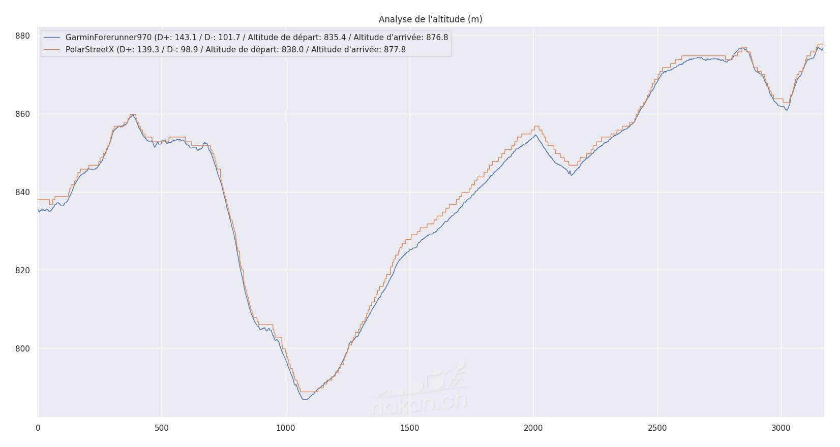Lors de ce comparatif de mesure d’altitude en course à pied avec la Garmin Forerunner 970, on note aussi des données très cohérentes. Les différences sont infimes tant en mesure absolues que sur les cumuls de dénivelés: