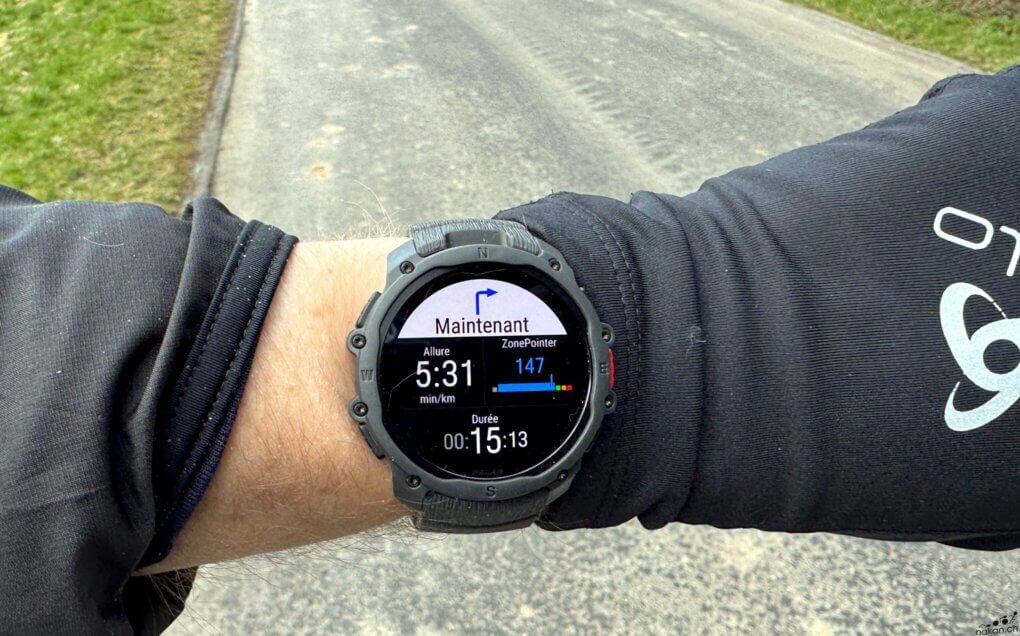 La montre permet d’afficher les informations de turn-by-turn si on les active dans le suivi d’itinéraire (à faire à chaque fois qu’on lance la navigation, comme sur les autres montres de Polar).